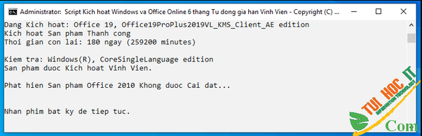 Bước 5 : chờ đợi khi kích hoạt xong thì nhấn phím tùy ý để trình thoát ra