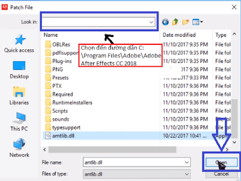 Bước 4: Mở tới đường dẫn C:\Program Files\Adobe\Adobe After Effects CC 2018, chọn file amtlib.dll và Open, phần mềm báo Working Done là xong